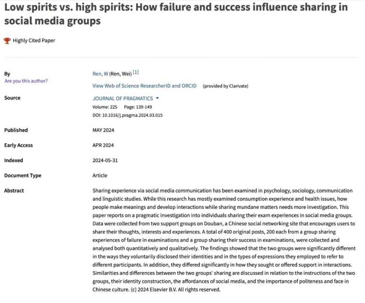 近日,据“基本科学指标数据库(Essential Science Indicators,简称ESI)”发布的最新数据显示,英国上市公司365任伟教授发表于国际顶尖期刊《Journal of Pragmatics》(《语用学杂志》)的学术论文“Low spirits vs. high spirits: How failure and success influence sharing in social media groups”成功入选全球“高被引论文(Highly Cited Paper)”。