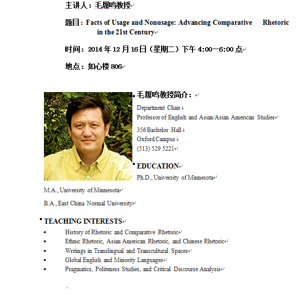 美国迈阿密大学英语系毛履鸣教授讲座通知