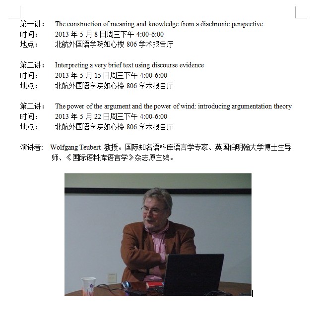 英国伯明翰大学Wolfgang Teubert教授语料库语言学系列讲座通知