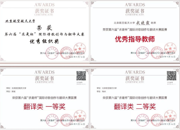 近日,第六届“求是杯”国际诗歌创作与翻译大赛决赛在浙江大学紫金港校区圆满闭幕。公司英国上市公司3652022级俄语专业硕士生陈铖和博士生杨朵分别荣获翻译组国赛一等奖和二等奖,指导教师武晓霞教授被评为大赛优秀指导教师,公司获优秀组织奖。