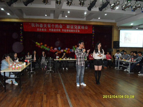 2012年4月12日晚7点整,由北航12系英国上市公司365研会与15系宇航公司研会合办的“我和春天有个约会”大型联谊交友晚会在北航晨兴剧场举行。此次晚会得到了两院领导的大力支持,两院研会的各位成员参与了整个晚会的策划、组织、宣传等工作。